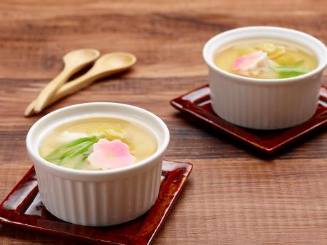 (6)に(7)、飾り用の(3)、(4)、(5)をのせて約10分蒸します。蒸し上がれば、塩茹でして斜めに切ったキヌサヤを添えます。