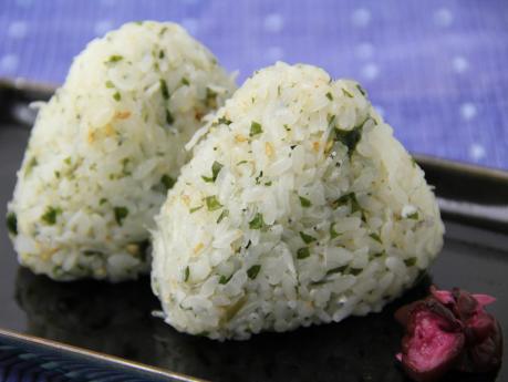 ごはんが温かいうちに、刻んだ(3)、(4)、(5)を混ぜ、器に盛ります。