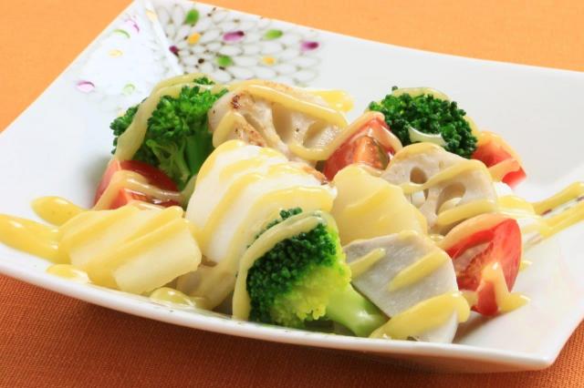 洋梨は皮をむいて芯をとり、7mm幅のイチョウ切りにします。プチトマトはヘタを取り、縦4等分に切ります。ブロッコリーは小房にして塩を加えた熱湯で茹で、ザルにあげます。