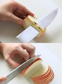 リンゴは皮つきのまま芯をとり、2mm厚さにスライスします。